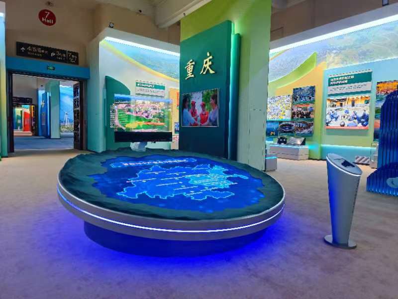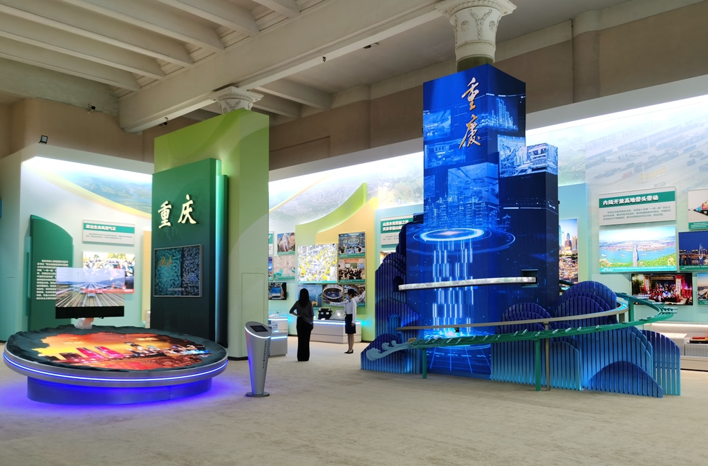 重庆单元与四川单元、广东、香港、澳门单元同在展馆7号厅,形成粤港澳大湾区、成渝地区双城经济圈两大空间板块。重庆单元展区面积约为180平米,空高9米,可展示区域6米高。展区由主体展墙和实物模型、亮点展项、专题视频组成,共展示了5个亮点展项、43张代表性图片、41个视频、2张图表、25件(套)实物。现场工作人员为观众们介绍道:“图片图表、音视频、文物实物、雕塑绘画、场景复原、沙盘模型等不同的布展形式,都可以在重庆单元看到。”