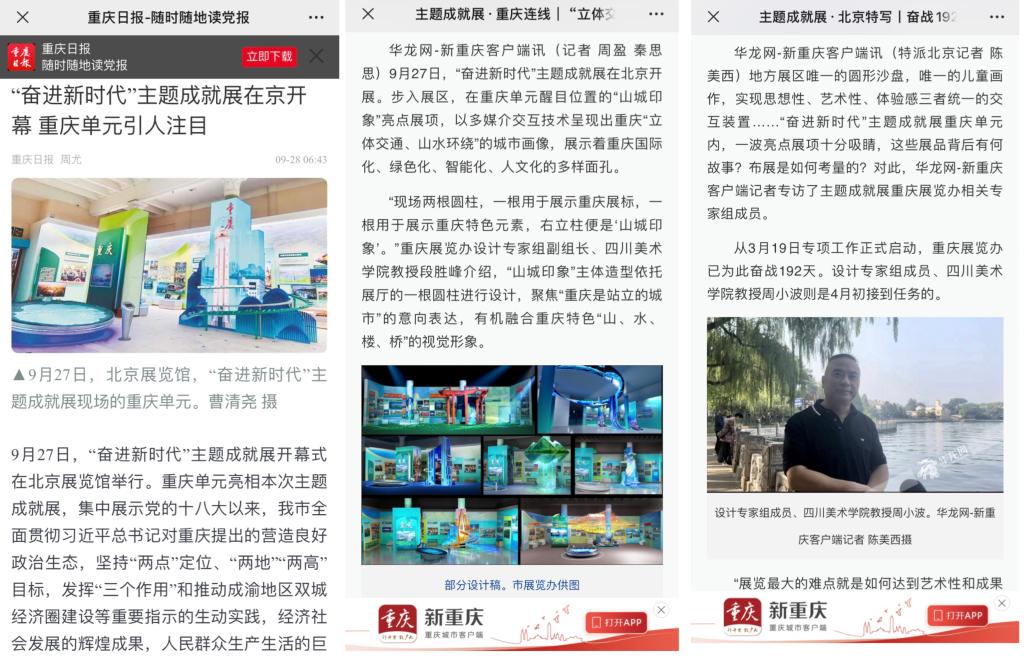“奋进新时代”主题成就展开幕后,我校师生团队设计的“山水城印象”装置、“长江之歌”互动装置、成渝地区双城经济圈电子沙盘、“人民幸福生活”等特色展项,在现场备受好评、引人注目,很多观众在重庆单元驻足观看,饶有兴致地与展场装置互动,体验沉浸式观展。重庆单元展区及其设计制作团队的创作历程也得到了各大媒体的广泛关注与深度报道。