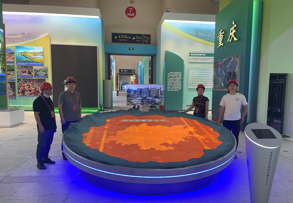设计制作团队的主要任务包括:展区空间设计、展墙版式稿设计、展标墙设计、亮点展项设计制作、成渝地区双城经济圈沙盘设计制作、展区视频内容制作等。经过团队全体成员为期6个月、共计175天的奋战,最终顺利完成重庆单元展区的设计、制作、安装、调试等一系列工作任务,确保重庆单元在“奋进新时代”主题成就展上如期圆满展出。