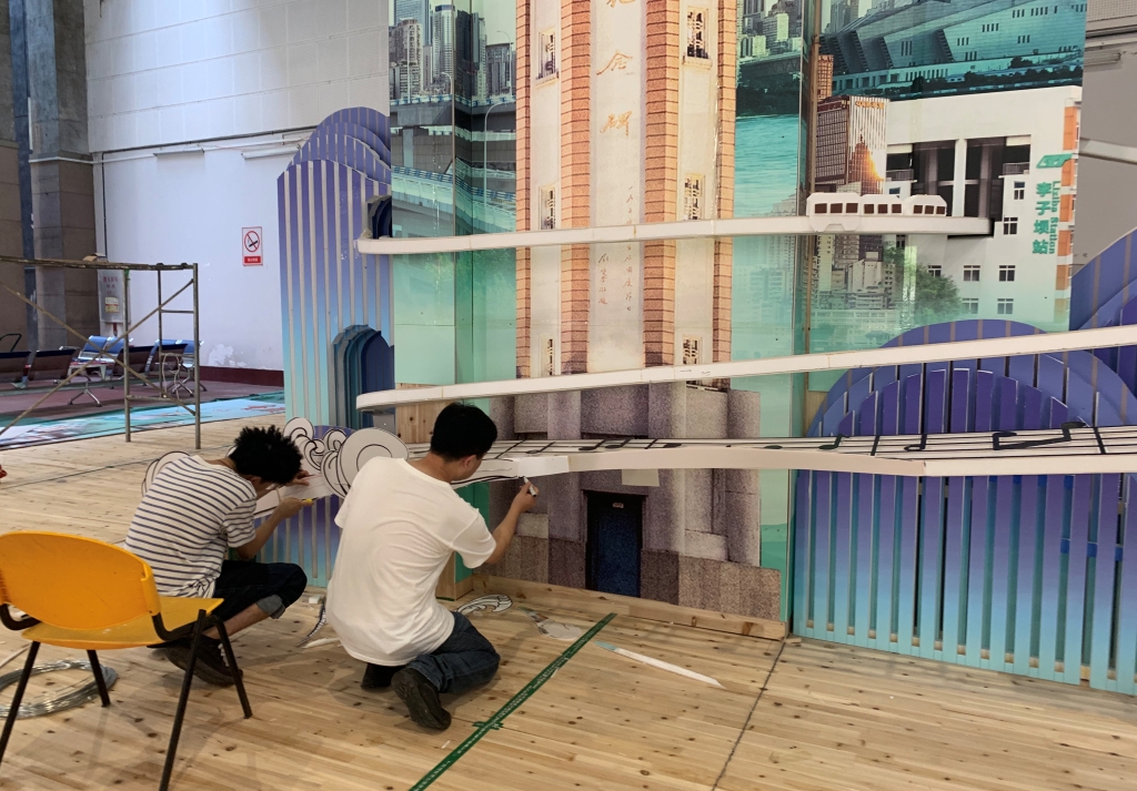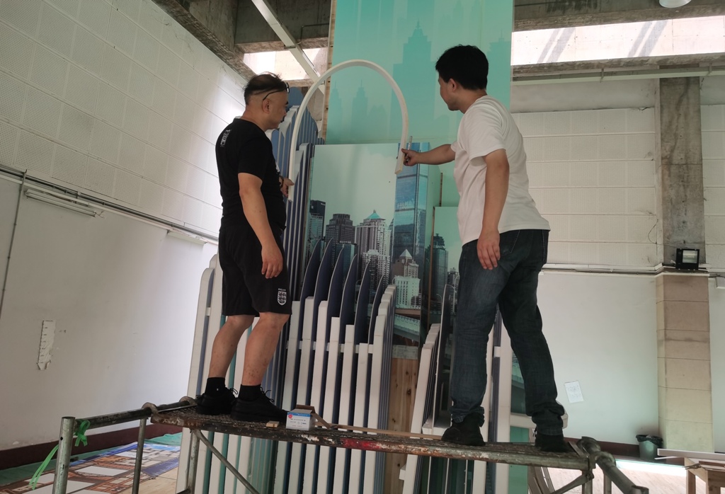 经过前期4个月数十稿的设计模型修改完善,设计制作团队从8月3日开始,在川美虎溪校区进行了1:1造型放样,并逐步完成“L形裸眼3D视频”第七稿、“山水城印象”主题视频第七稿、“长江之歌”视频1:1放样现场测试,于8月9日转战至璧山加工厂继续进行制作。