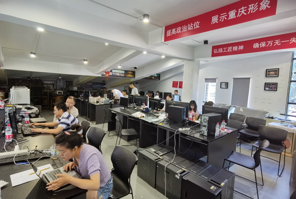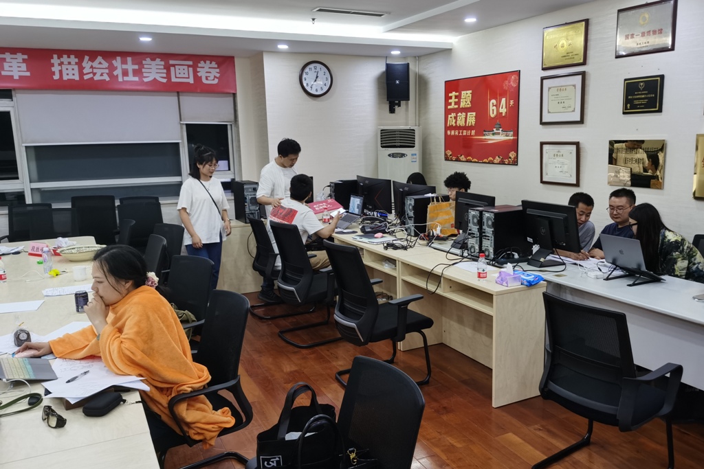 7月、8月暑假期间,是设计深化与制作集中攻关阶段。在重庆极端高温情况下,团队师生们始终把使命与责任放在第一位,不畏酷暑,齐心攻坚,确保如期圆满完成任务。深化设计方案包括:展区整体空间规划,主造型“山水城印象”及6个正面面主题视频,“长江之歌”艺术互动装置,山城人民幸福生活浮雕墙及8个主题内容,成渝双城经济圈电子沙盘及视频动效制作,重庆智造三个亮点展项L形裸眼3D视频制作,展览主题文创产品设计,重庆单元讲解员服装设计等内容。截止2022年8月15日,团队制作完成视频总时长4280秒,累计设计和拍摄专题视频超过56个小时。