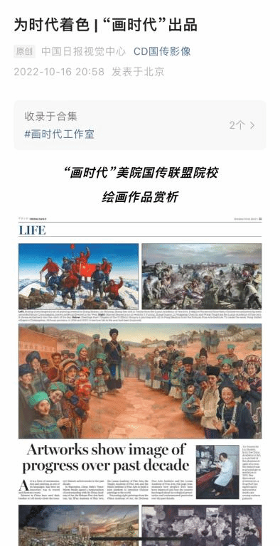 “中国日报视觉中心”(CD国传影像)公众号还于10月16日党的二十大胜利召开当日,推送了文章《为时代着色——画时代美院国传联盟院校绘画作品赏析》。