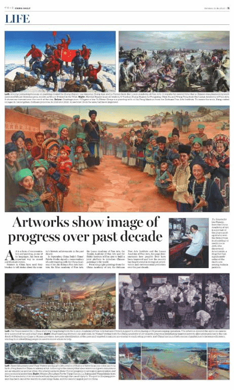 10月15日,党的二十大胜利召开前夕,中国日报为喜迎二十大,开创了创刊四十一年来美术作品整版图片版之先例。《中国日报》2022年10月15日11版(PAGE 11,OCTOBER 15,2022 CHINA DAILY)刊登了来自中国美术学院、四川美术学院、鲁迅美术学院的画作,向党的二十大胜利召开献礼。其中,我校庞茂琨校长的油画作品《彝家新村欢迎您》的大幅画面显得格外醒目,极具艺术美感和视觉冲击力。