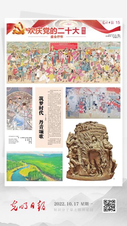 该版文章《筑梦时代 丹青颂歌》指出,党的十八大以来,广大美术工作者以为时代画像、为时代立传为使命,聚焦新时代党和国家中心任务,围绕新时代重要事件、重点任务和重大成就,积极深入社会生活,真切感受当代景观,以高昂的激情表现时代精神、以真挚的情感塑造人民形象。文章最后指出,新的征程豪迈向前,美好画卷徐徐铺展。广大美术工作者脚步不停、笔墨正酣,描绘着新时代的火热气象、精彩篇章。