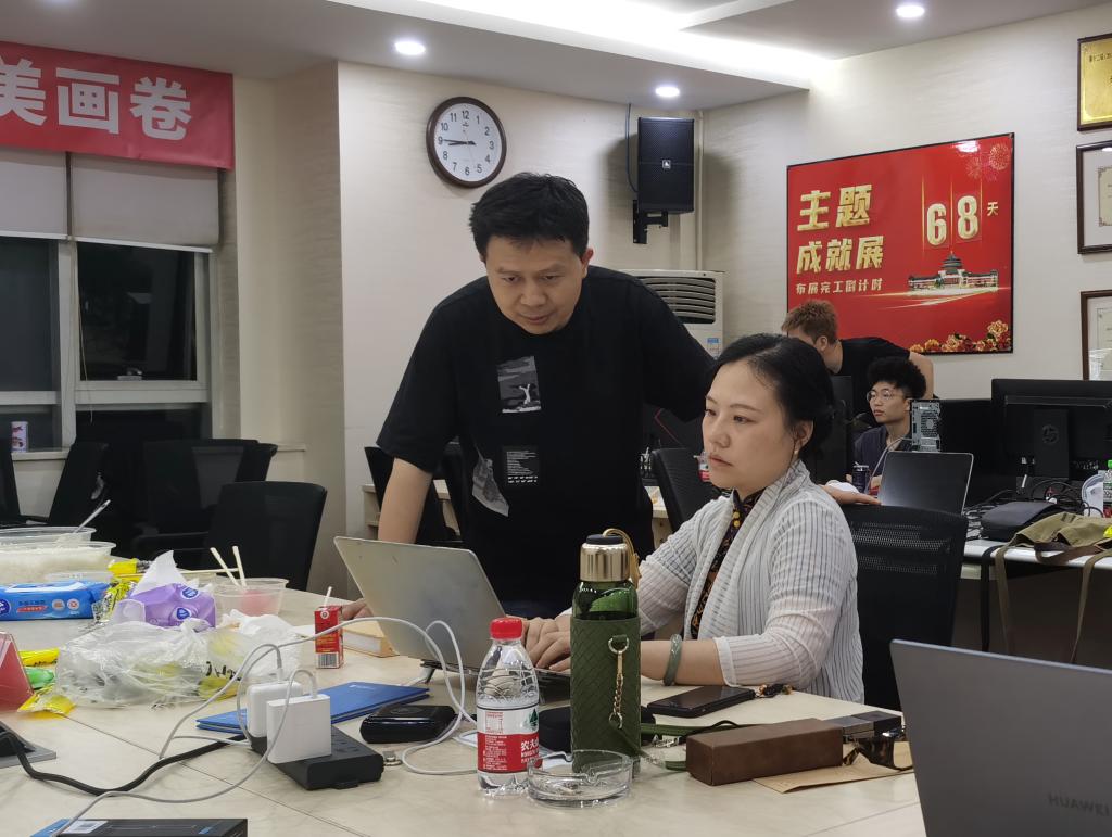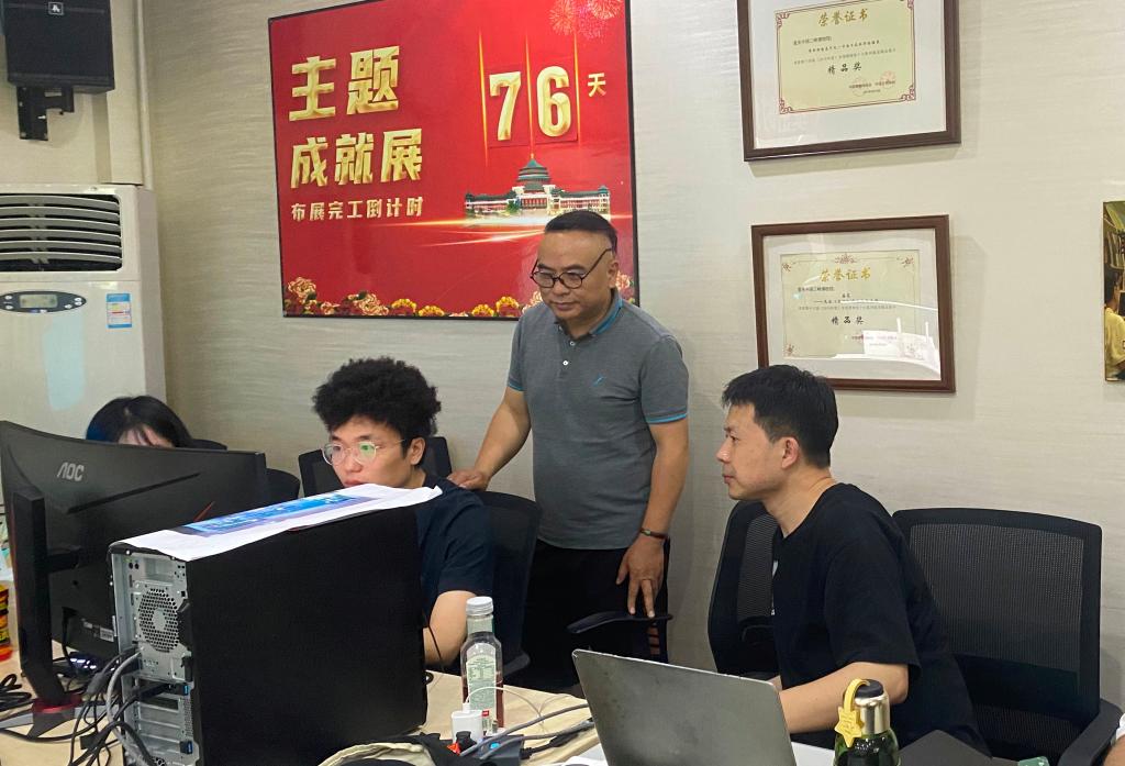 吴菡晗(左三)与驻京展览办工作人员讨论布展细节