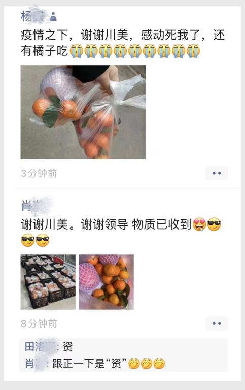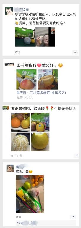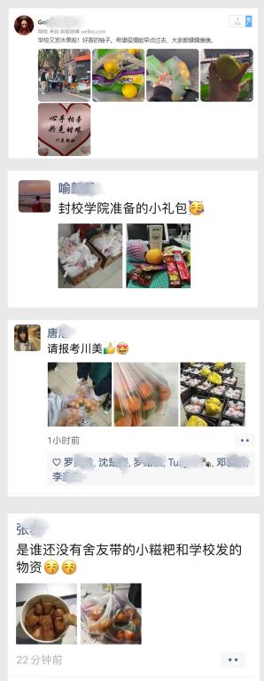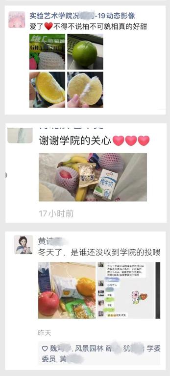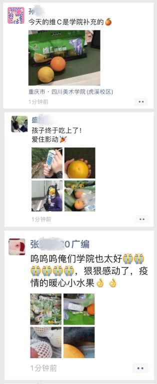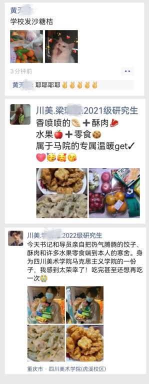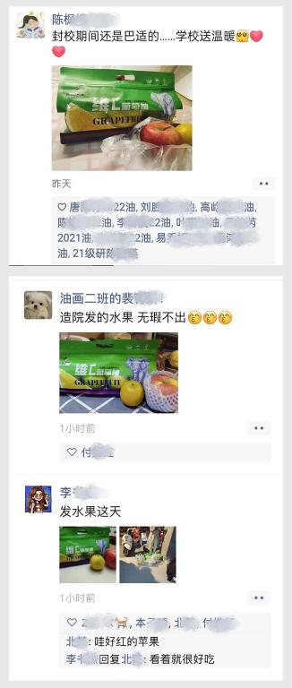 11月12日、13日,在学校的统一部署下,各二级学院“想方设法”为同学们“送温暖”,把一包包水果、牛奶、休闲小食、防疫用品等物资送到每一位学生手上,在刚刚降温的深秋为同学们带去浓浓的关爱与温暖。同学们深受感动、非常开心,纷纷发微信朋友圈晒图,表达对学校、学院无微不至关怀的感谢和感动之情:“真是被川美暖到了!”“感谢川美”“在校不愁”“我又好了”“请报考川美”“希望暖洋洋的物资和心情能缓解和对抗冰冷无情的疫情”“齐心协力,共克时艰,让这个冬天持续温暖”......