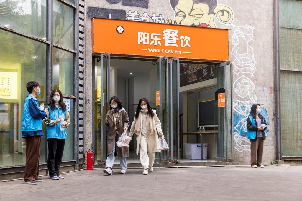 (同学们到食堂打包餐食回寝室用餐,志愿者做好防疫服务)