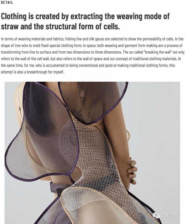 来源于传统草编与细胞,通过提取草编的编织方式与细胞的结构形态来进行创作。借助细胞的不同形态在服装廓形与造型结构上进行创新,以此来探索服装与人体之间的空间及穿插关系。