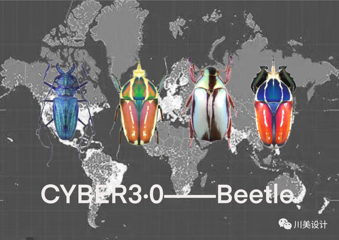 此系列作品以甲虫为灵感,我通过饲养甲虫来观察它们的造型和行为,最终选择了几种有“Cyber”感花纹的甲虫,提取其造型、纹样和色彩元素进行转化设计,材料上运用TPU染色和绢布上漆工艺表现甲虫硬壳上变幻的色彩和金属般坚硬具光泽的质感,希望通过此设计让大家关注自然界中这类奇妙且有趣的生物。