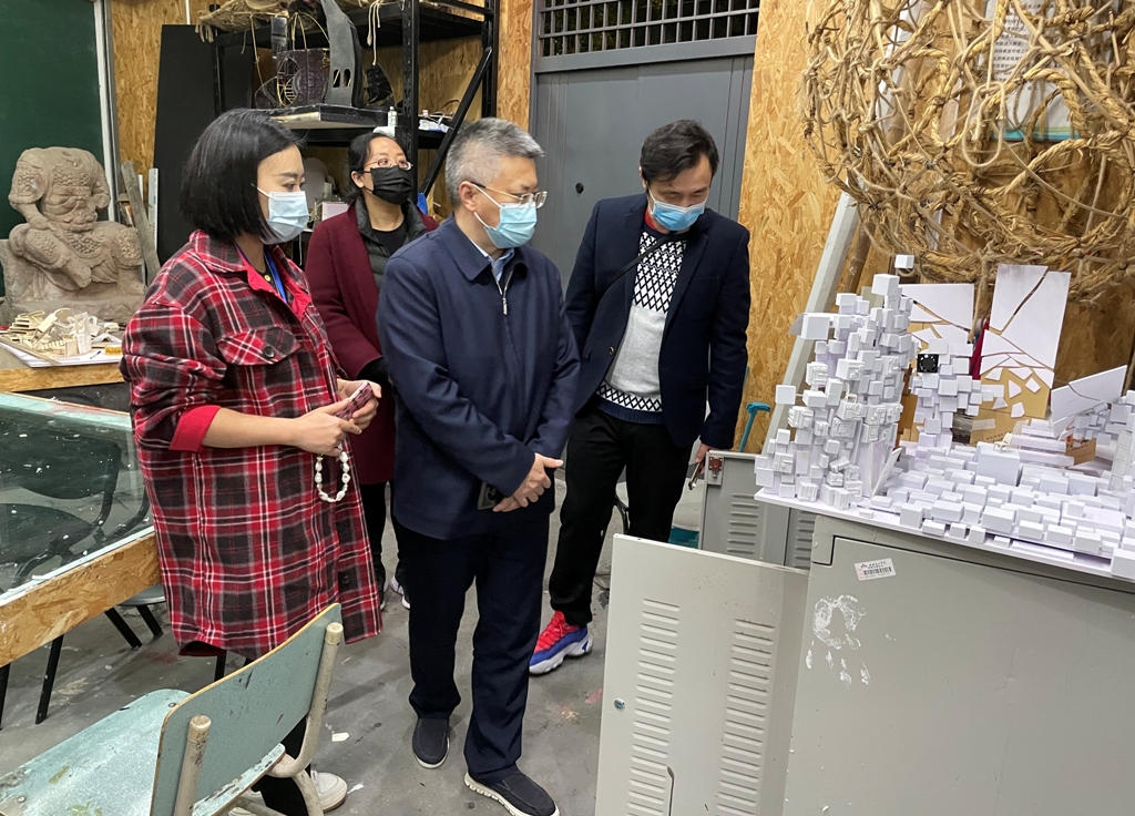 在学生自习室,唐青阳书记亲切鼓励考研学生努力学习,提醒他们离开教室记得断电。在模型制作教室,热熔枪、电锯等电器都按要求断开电源有序摆放,插座等按要求断电,但学生作业仍有摆放不整齐的情况。