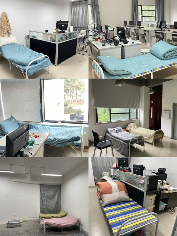 因疫情防控需要,留校教职员工与志愿者们毅然选择在黄桷坪校区坚守阵地,因校区是高风险区,于是办公室、机房、教室、图书馆等地成为他们临时的“家”。这些天,他们白天参加疫情防控工作,晚上在一张张窄窄的行军床上休息,工作和休息场所融为一体。疫情来势汹汹、猝不及防,他们克服艰难的生活环境,以积极乐观的态度面对每一天,用自己坚定的行动诠释着什么叫做迎难而上,与同学们共进退,早日实现校园内清零目标。