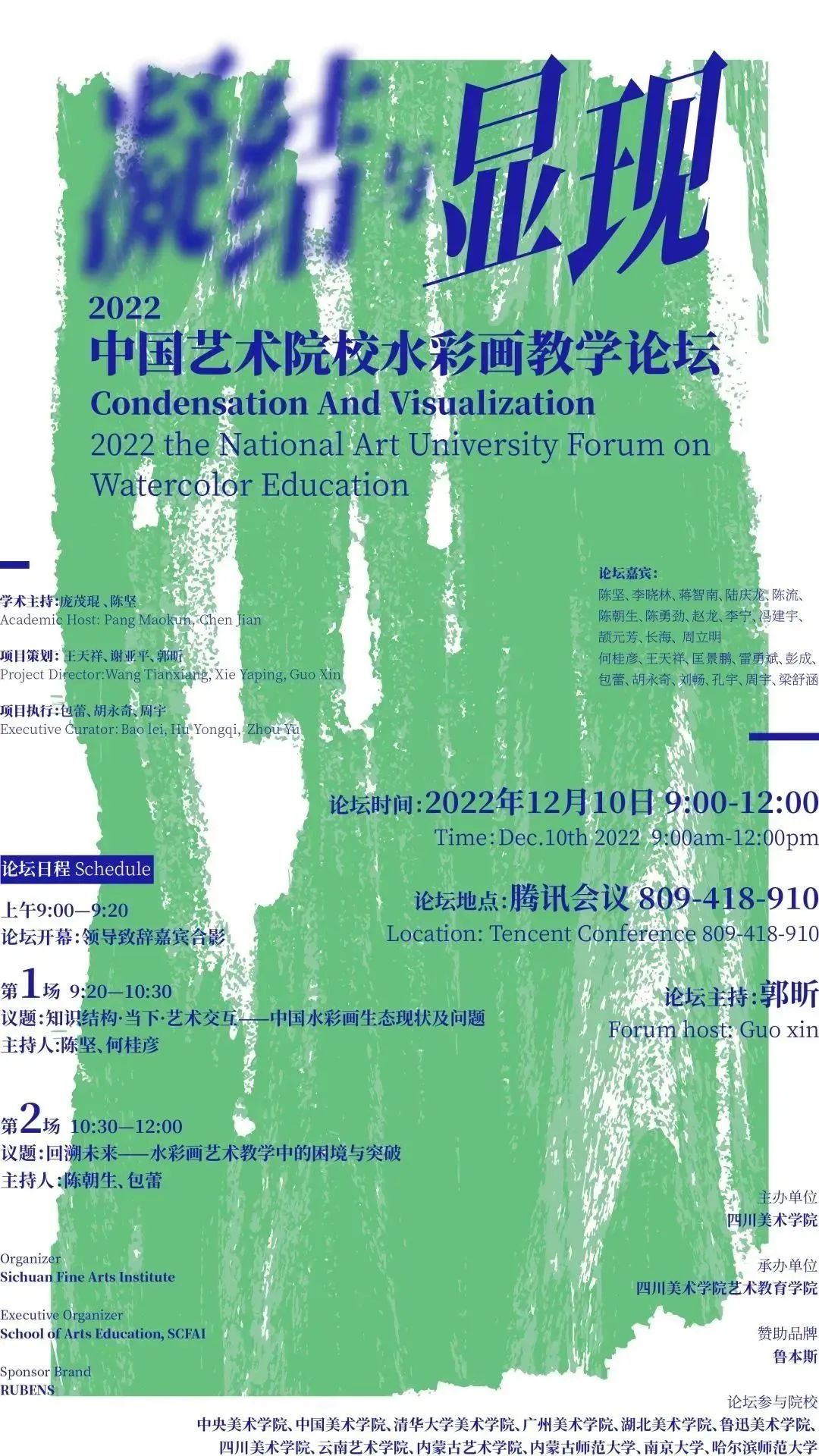 由四川美术学院主办、艺术教育学院承办,四川美术学院校长庞茂琨,中国美术家协会水彩画艺委会主任、中国美术学院教授陈坚担任学术主持的“凝结与显现——2022中国艺术院校水彩画教学论坛”,于12月10日顺利举办。本次论坛立足中国高等艺术院校水彩画教学体系中的一些问题,以问题研讨的形式,针对中国水彩画生态的艺术史谱系缺失、水彩画当代性的定位、当下中国水彩画创作的新现象和突出问题等方面开展了较为广泛的讨论。本次论坛由艺术教育学院副院长郭昕担任主持人。