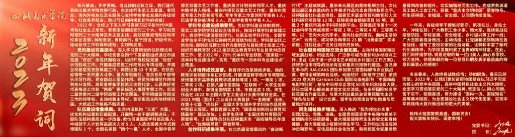 新元肇启,岁序更新。值此辞旧迎新之际,我们谨代表四川美术学院党委行政,向全体师生员工及家属、老同志、海内外校友以及长期关心支持学校事业发展的各级领导、社会各界朋友,致以节日的问候和新年的祝福!