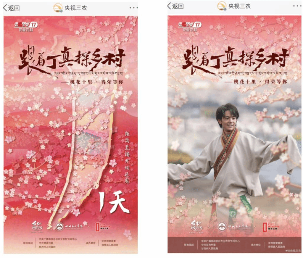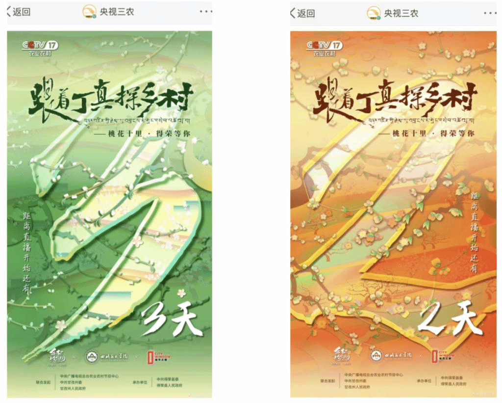 3月22日至25日,CCTV-17官方“央视三农”微博连续发布了“桃花十里,得荣等你”活动的系列倒计时海报和主视觉海报,持续为活动宣传造势。系列海报由CCTV-17和四川美术学院联名创作发布,融合了桃花、峡谷、梯田等当地特色元素。