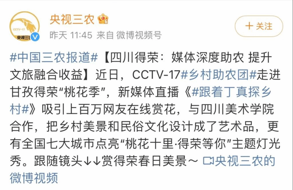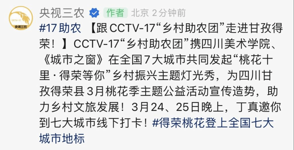 3月19日、24日、25日晚,CCTV-17携四川美术学院、《城市之窗》传媒在上海、广州、重庆、成都、西安、东莞、珠海等七个城市共同发起“桃花十里·得荣等你”乡村振兴主题灯光秀,为四川甘孜得荣县3月桃花季主题公益活动宣传造势,助力乡村文旅发展。灯光秀活动引起媒体和公众的广泛关注,“央视三农”视频号进行了报道。