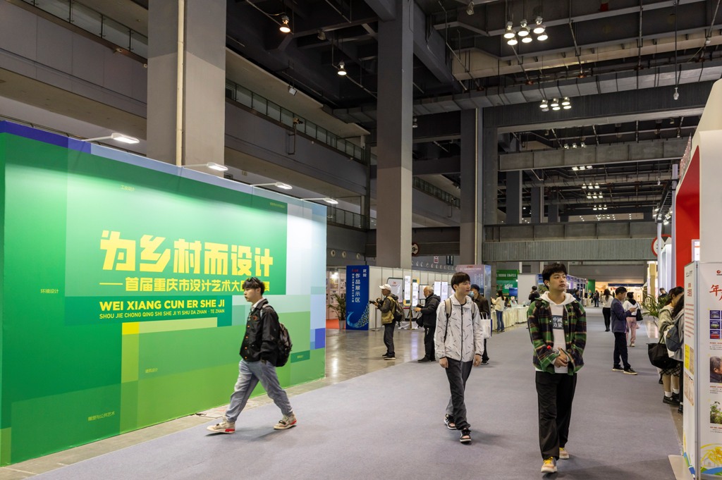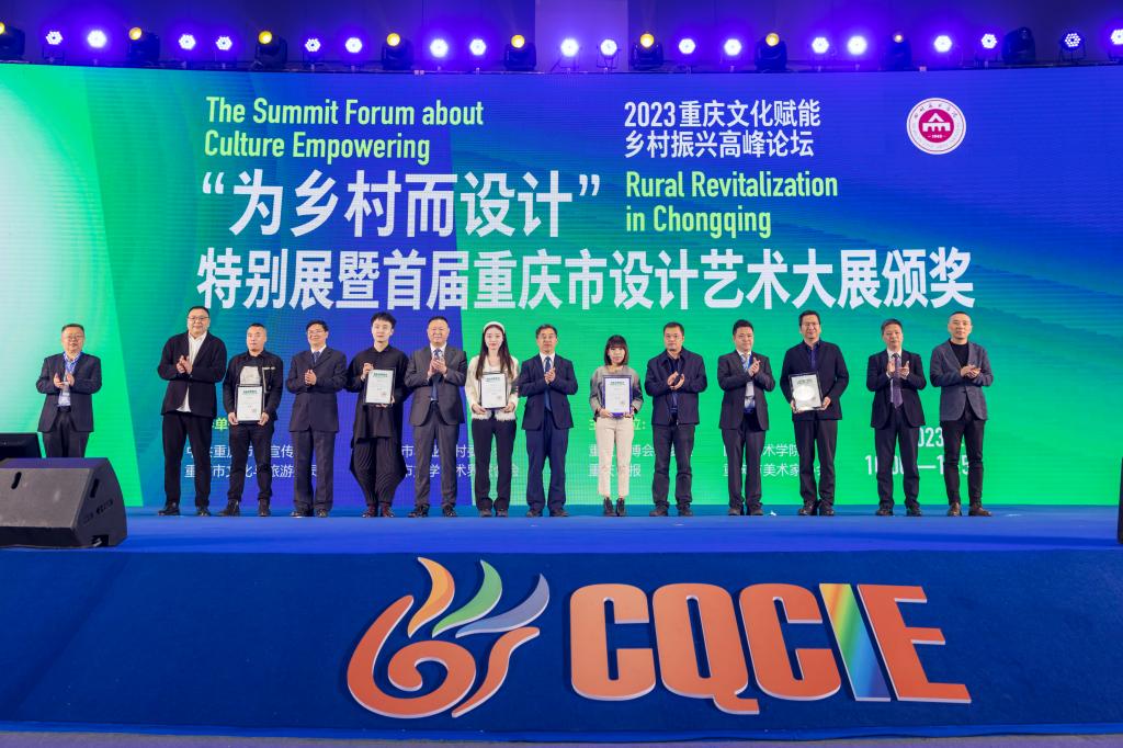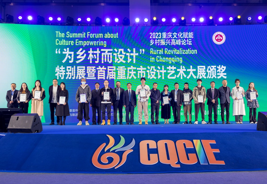 出席开幕式的领导为获得“为乡村而设计”特别展暨首届重庆市设计艺术大展金奖、银奖的获奖人员(团队)颁奖。重庆市文学艺术界联合会、市美术家协会、四川美术学院共同主办了“为乡村而设计——首届重庆市设计艺术大展”,旨在充分发挥艺术设计的跨学科优势,深入挖掘和整合乡村资源,从空间驱动、产业引领、文化创新、数字赋能等多方面发力,创造性走出一条设计赋能乡村振兴之路,加快农业农村现代化,抒写出重庆奋进新征程中的瑰丽篇章。展览自发布征稿以来,得到了全市广大美术家和美术工作者以及社会各界的高度关注和热情参与。经展览组委会组织评审专家进行严谨、细致的评审,最终从800多件投稿作品中遴选出了近200件优秀作品,覆盖了多个设计种类。