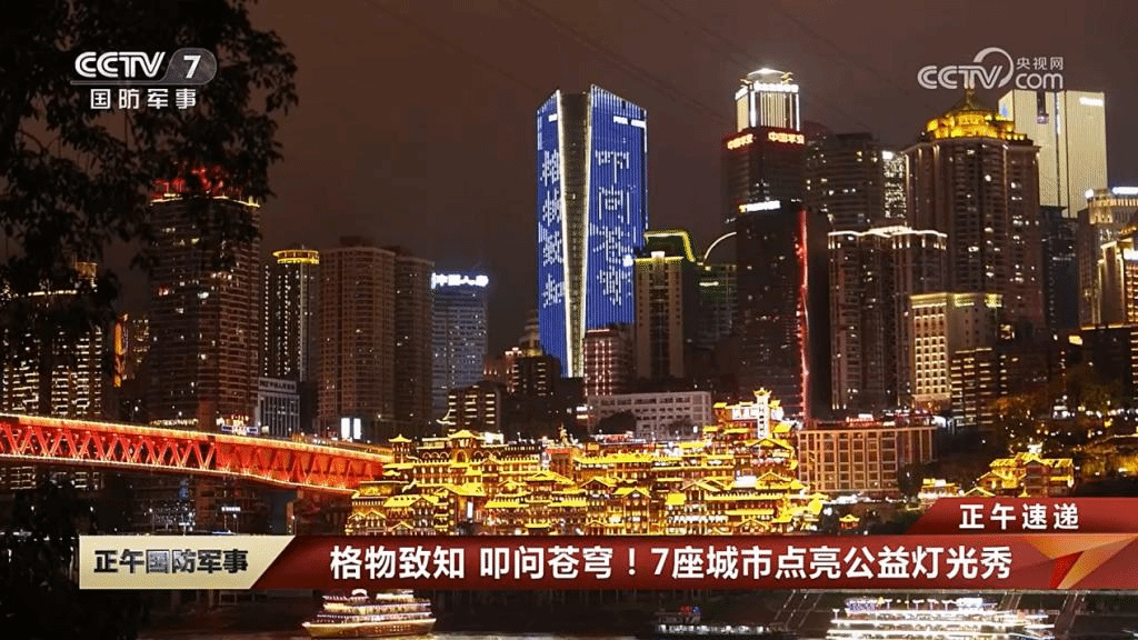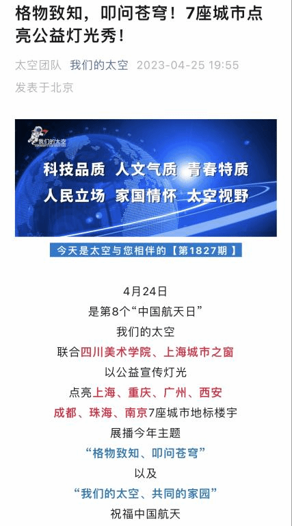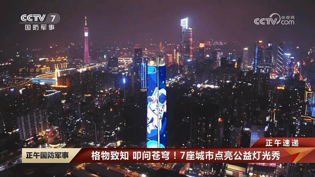 4月24日是第8个中国航天日。“我们的太空”融媒中心联合四川美术学院、上海城市之窗以公益宣传灯光点亮上海、重庆、广州、西安、成都、珠海、南京7座城市地标楼宇,展播今年航天日主题“格物致知、叩问苍穹”以及“我们的太空、共同的家园”,祝福中国航天。夜色中,巨幅动画在楼宇间展现,与城市的夜景构成一幅美丽画卷。CCTV-7国防军事频道、“我们的太空”融媒矩阵等媒体报道了此次公益宣传灯光秀活动,产生了较大影响力。