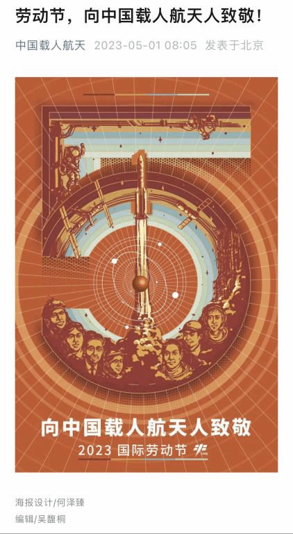 5月1日,中国载人航天工程官方公众号发布了由四川美术学院设计学院学生何泽臻设计的劳动节海报,向中国载人航天人致敬。