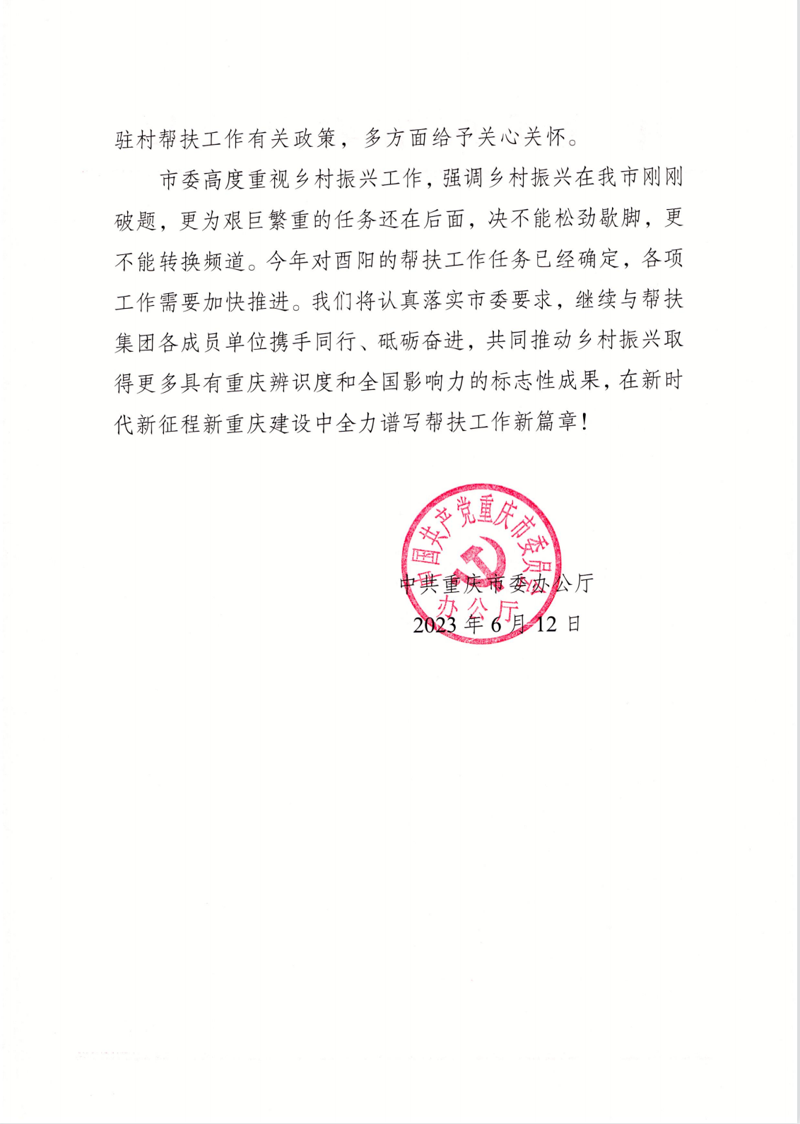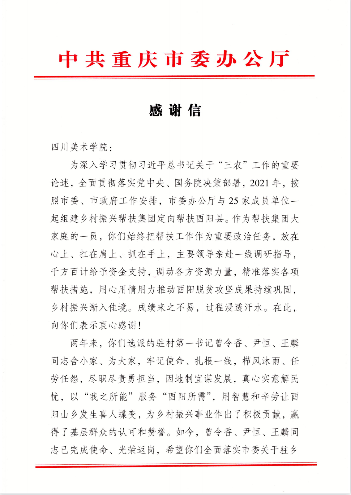 近日,中共重庆市委办公厅给我校发来贺信。贺信指出,四川美术学院始终把帮扶工作作为重要政治任务,主要领导亲赴一线调研指导,千方百计给予资金支持,调动各方资源力量,精准落实各项帮扶措施,用心用情用力推动酉阳脱贫攻坚成果持续巩固!选派的驻村第一书记曾令香、尹恒、王麟同志牢记使命、扎根一线,尽职尽责勇担当,因地制宜谋发展,真心实意解民忧,为乡村振兴事业作出了积极贡献,赢得了基层群众的认可和赞誉。