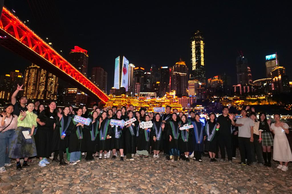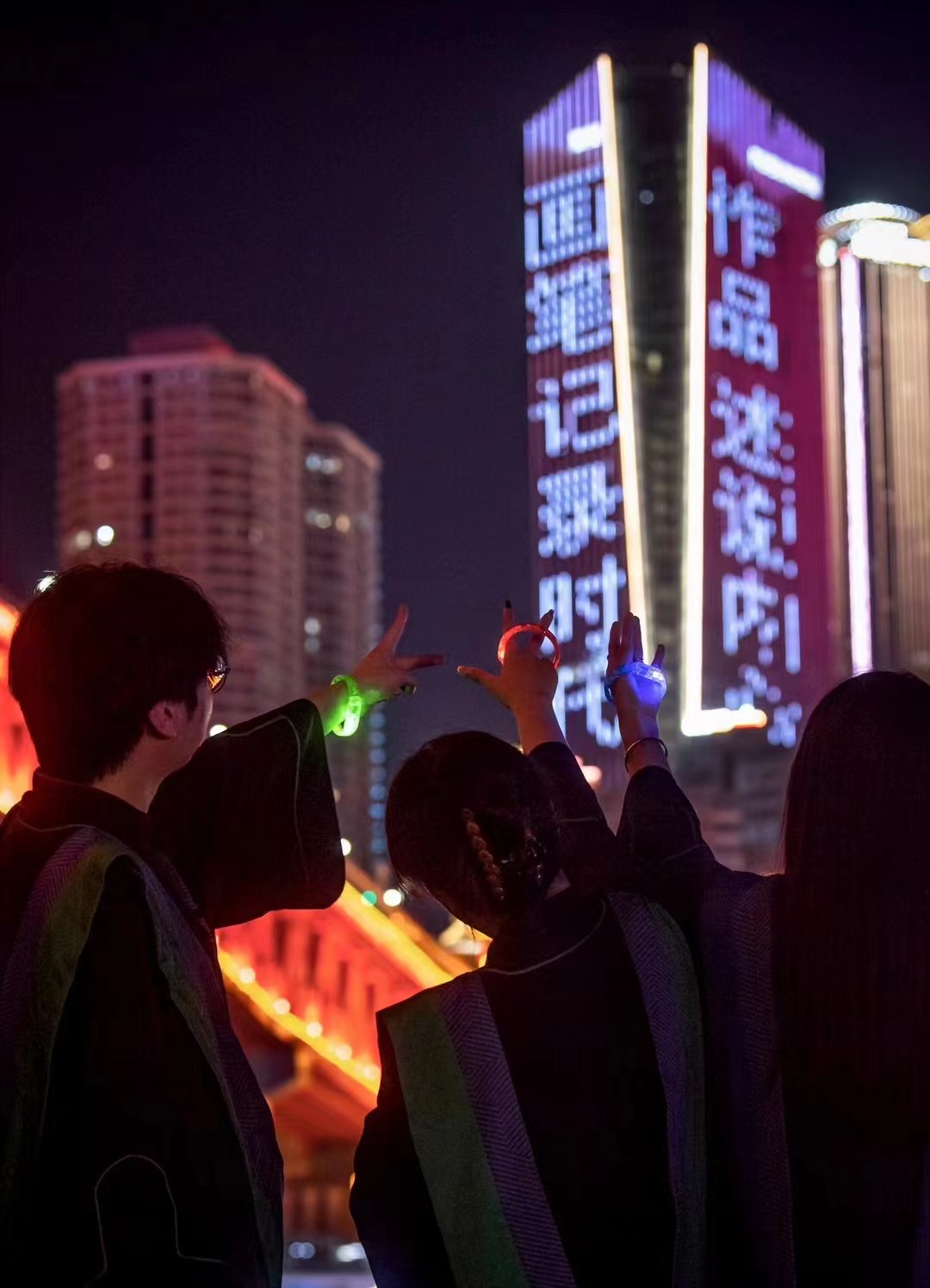 现场的老师们也感慨着四年时光转瞬即逝,仿佛刚步入大学的同学们又要搭乘列车离开了,奔赴满载着理想的远方。今年在城市最具代表性的位置,为川美全体毕业生送上最美好的祝愿;在最具纪念意义的时刻,留下印象最为深刻的照片。这一刻,城市地标为川美毕业生闪亮,相信同学们也将继续发挥专业所学,担当社会责任,不忘初心、砥砺前行,用更多更优秀的作品回馈社会、回馈人民、回馈母校,也必将创作出无愧于伟大时代的优秀作品,书写四川美术学院“出人才、出作品”新的辉煌。