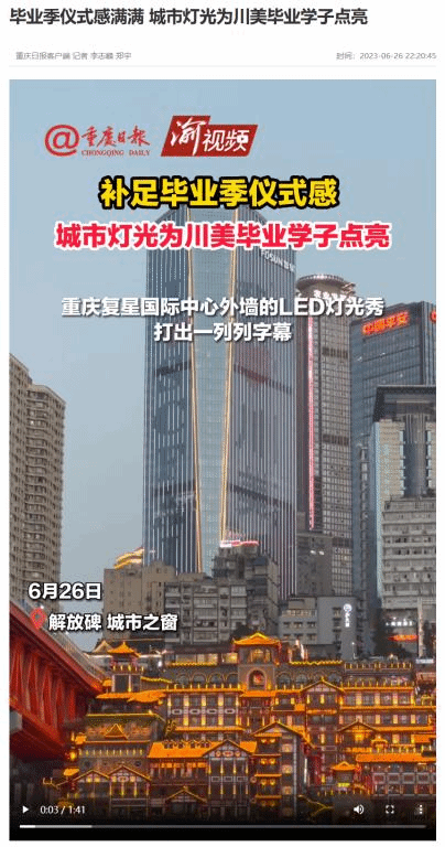 6月26日,四川美术学院2023毕业季特别计划-寻光绘梦举行。重庆复星国际中心灯光秀为川美2023届全体毕业生点亮,闪烁着母校寄语的“城市之窗”灯光秀,为毕业生送上了一份特别而珍贵的毕业礼物。此次活动由四川美术学院团委与城市之窗共同举办。