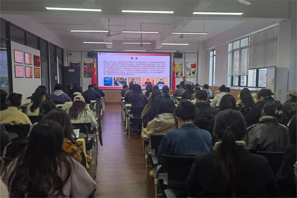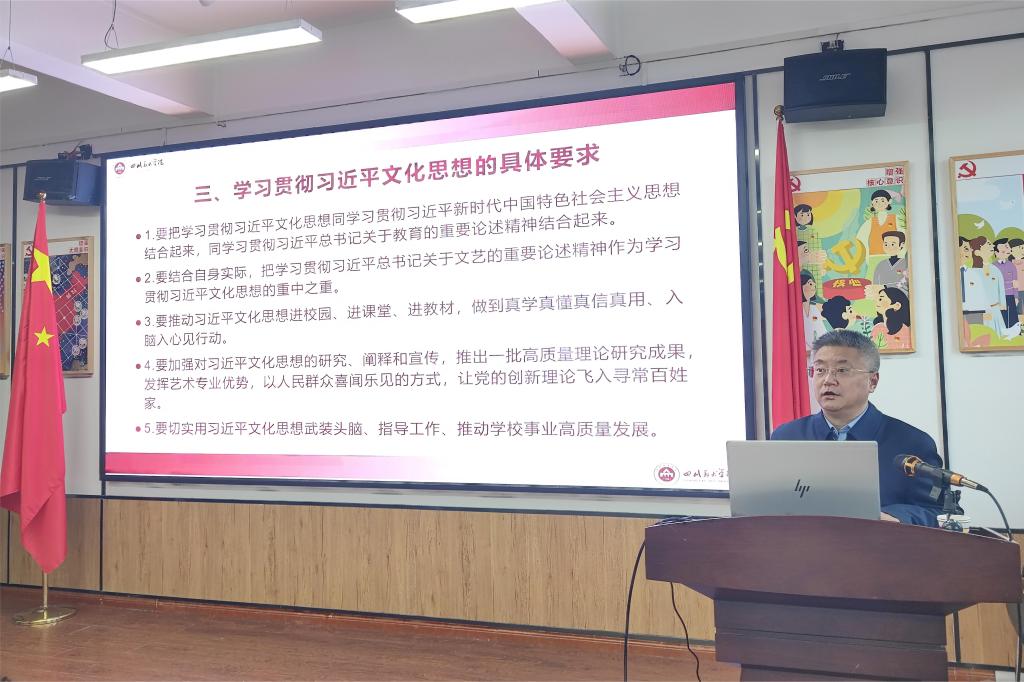 唐青阳从习近平文化思想所涉及的领域和内容讲解了习近平文化思想的核心要义,结合学校实际情况和艺术院校优势,指出要从“七个着力”“九个坚持”“十四个强调”等方面,理解把握习近平文化思想的核心,注重将习近平文化思想运用到教育教学和创作科研中,着力提升校园文化建设。