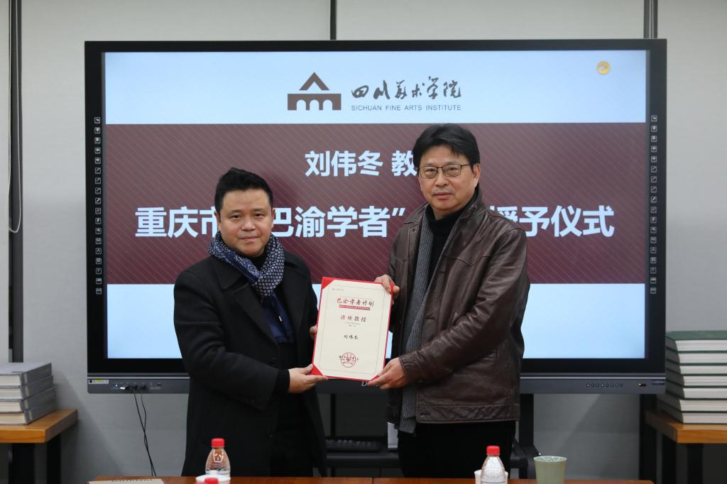 庞茂琨向刘伟冬颁发重庆市“巴渝学者”证书并致辞。他强调,教育部新版学科专业目录的调整,设置了艺术学学术学位点和美术与书法专业学位点,带来学科分布、研究生教育等方面的变化与改革,应进一步树立人才是第一资源理念,以人才强校战略助推学校事业高质量发展。