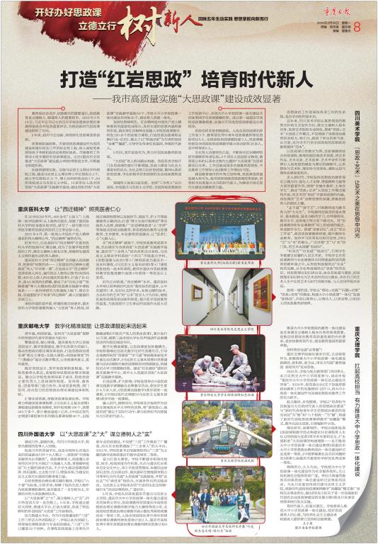 在习近平总书记在学校思想政治理论课教师座谈会上发表重要讲话五周年之际,《重庆日报》开辟“开好办好思政课,立德立行树新人”专栏,以题为《四川美术学院“思政+艺术”让艺术之美在思想中闪光》报道我校五年来在“大思政”教育格局培育、马克思主义学院建设、思想政治理论课创新等方面取得的成绩。