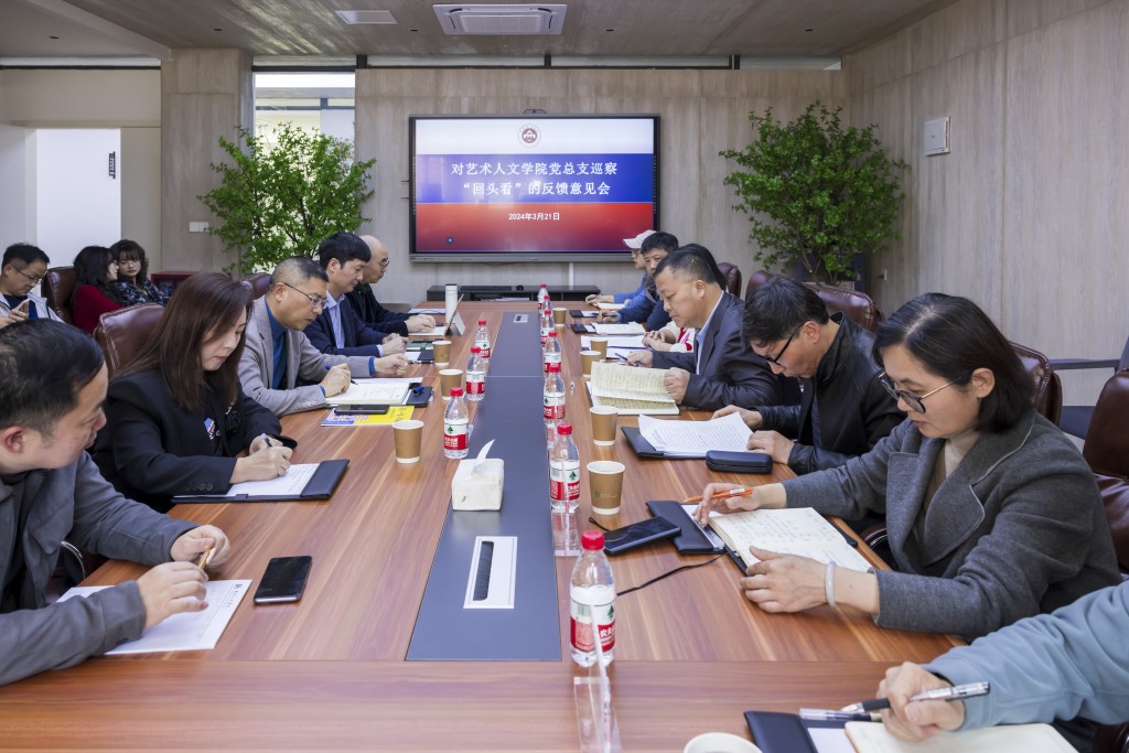 党委巡察“回头看”工作组成员、艺术人文学院全体教职工参加了会议。