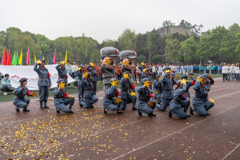 影如蛟龙戏水,动似鹰击长空。影视动画学院的表演以红旗方阵为主题,动作有力、整齐划一,以富有力量感的演出体现了学院运动员的拼搏奋斗精神。