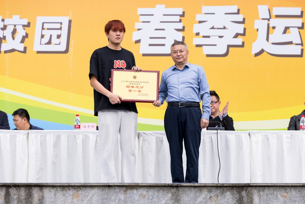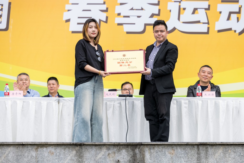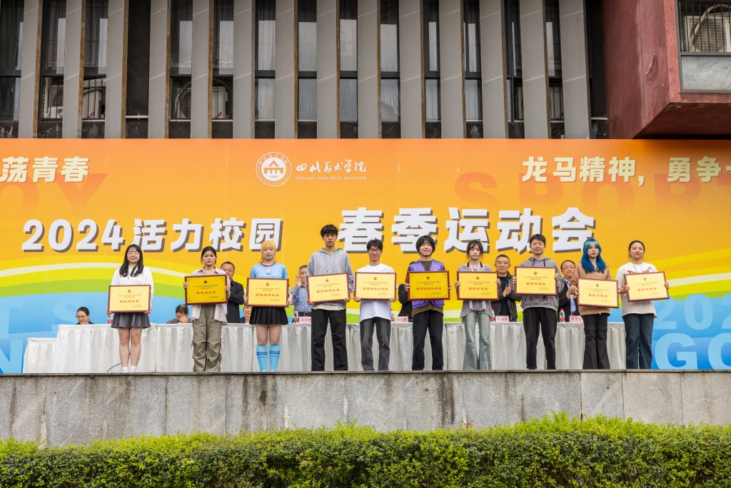 唐青阳为获得2024年校运会团体总分第一名的设计学院颁奖,庞茂琨为团体总分第二名的造型艺术学院颁奖,左益为团体总分第三名的公共艺术学院颁奖。校领导分别为最佳方阵奖、最佳创意奖、体育道德风尚奖、最佳啦啦队奖、最佳进步奖等获奖单位颁奖。