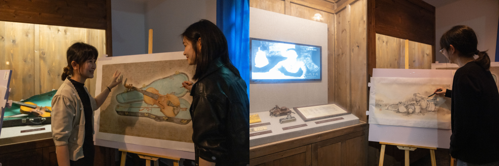 工作坊的第一课,是由学校马克思主义学院思政课教师杨晶讲解红岩精神。川美思政课教师既要有思政教学扎实的功底和本领,又要对艺术经典有相当的认知、熟知、真知。杨晶通过整理挖掘以红岩精神为主题的经典美术资源,将艺术作品、艺术名家、艺术故事、艺术声音作为案例引入到思想的阐发与理论的阐释中,从思政的角度考量了“艺术”专业的实际,从专业的角度协同了“思政”元素的要求。作画前先学习红岩精神内涵,可以帮助学生们在艺术创作中融入个人的历史感悟和思政理解。身处历史现场,学生们能够直观地感受历史遗址所蕴含的深厚文化底蕴和革命先烈的英勇事迹。