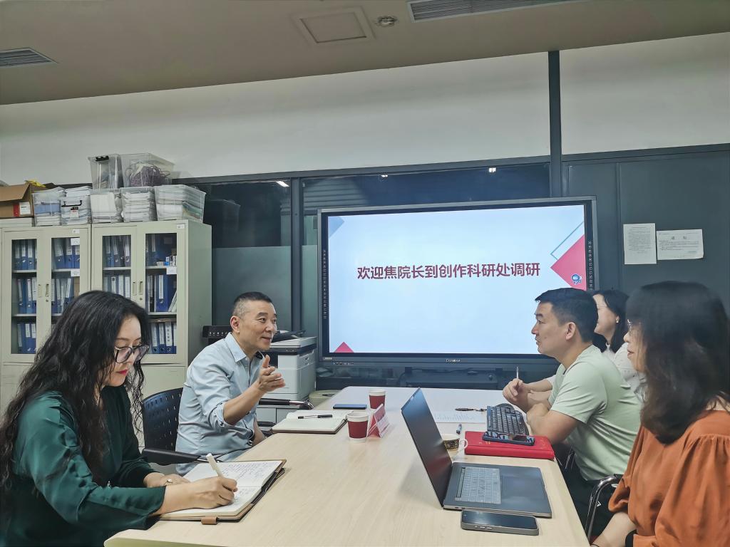 焦兴涛还就科研项目、学科建设、学术委员会工作、科研平台建设、成果转化、学术成果推介、学术活动等方面,与创作科研处工作人员深入交流。
