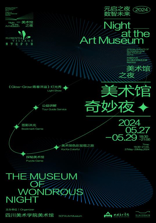 今年“美术馆之夜·公共美育周”将于5月26日至6月10日展开,围绕“元启之夜•数智未来”这一主题,将整体公共美育活动划分为三个单元:“国窖1573·美术馆之夜”跨界视觉秀(5月26日晚举行)、“美术馆奇妙夜”(5月27日至29日夜间延时开放)以及系列公共教育活动(5月27日至6月10日持续推出)。