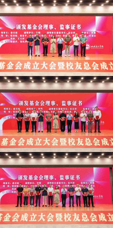 在基金会成立大会上,市民政局宣读了关于重庆四川美术学院教育基金会的行政许可决定。吴玉洪、何悦和唐青阳、焦兴涛共同为基金会揭牌,并向基金会理事会(监事会)成员颁发理事(监事)证书。理事长潘召南、副理事长钟飚、副理事长兼秘书长宋宗祥、监事长黄勤,理事张国魁、谢亚平、周宗凯、王朝刚、韦嘉、吕曦、郭晏麟、黄耘、何桂彦、杜泰山、周波、王天祥、李川、宗宇,以及监事陈德洪、邹凤洪上台领取了证书。