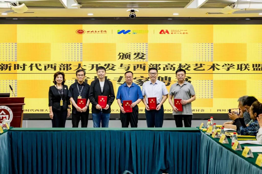 四川美术学院艺术人文学院学术院长、西部艺术与中华民族共同体研究院院长黄宗贤宣读了新时代西部大开发与西部高校艺术学联盟首批27位专家的聘任名单,以及西部艺术与中华民族共同体研究院首批校内研究员聘请名单。文云英、左益为专家与研究员们颁发聘书并合影留念。