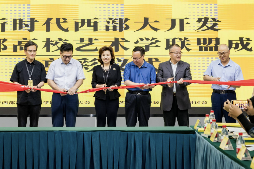 文云英、赵海忠、左益和广西艺术学院党委副书记、校长韦俊平,新疆艺术学院党委常委、宣传部部长周达疆代表联盟单位共同为联盟成立仪式剪彩。