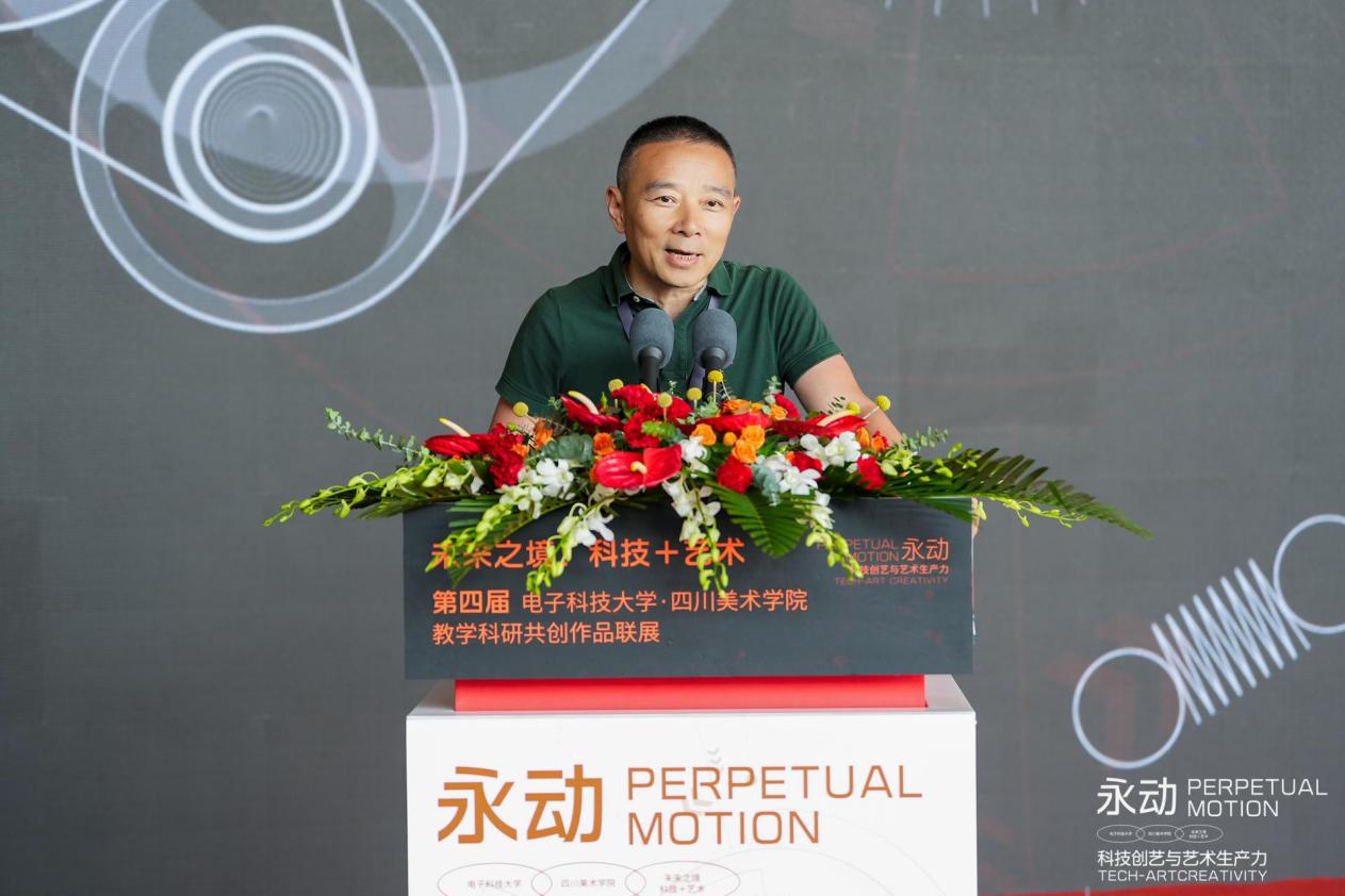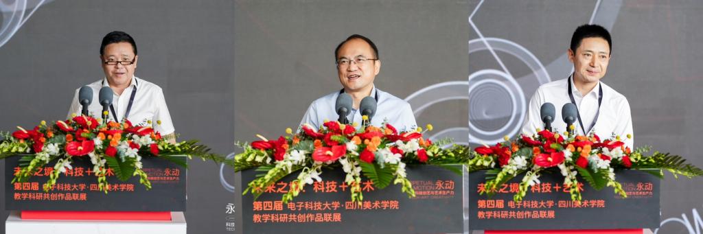 四川美术学院院长焦兴涛,电子科技大学党委书记曹萍,联展总策划和项目发起人——中国美术家协会副主席、四川美术学院原院长庞茂琨和电子科技大学原校长曾勇等嘉宾出席开幕式并致辞。电子科技大学副校长孔令讲主持了开幕式。