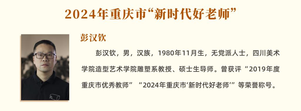 始终坚持以人民为中心,师生共创精品力作。引导学生胸怀“两个大局”,倡导新时代艺术观的创作引领作用。2022年重庆缙云山山火事件后,他融合现实感人的生活体验,启发个体与社会情境的交互,提炼内在感知,以消防官兵阻击森林火灾为主题,组织学生一起进行多件场景性雕塑创作,作品引起积极的社会反响,捐赠给了当时救援的云南森林消防总队,陈列于消防博物馆中永久展出。他积极探索教学方法的改革与创新,将思政教育寓于专业课程教学之中,寓政治导向于学术活动之中,寓理论学习于艺术创作之中,取得明显成效。凭借在教学方面的一系列突出成绩,他多次获得“四川美术学院优秀教师”称号,并被评为“重庆市优秀教师”。