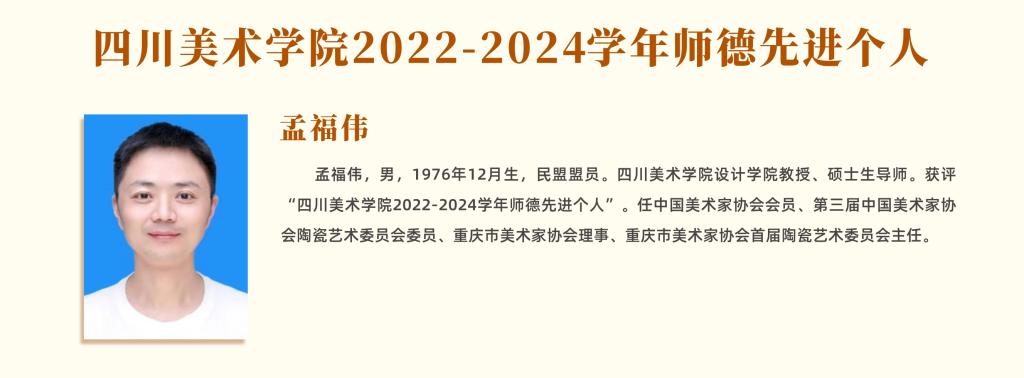 潜心探索当代中国陶艺创作实践,在陶艺创作实践中引导学生将古老的陶瓷工艺与现代艺术理念相结合,鼓励青年学生与青年陶艺家扎根生活,坚持学赛结合、学用结合,坚定文化自信,传播与发展陶艺文化。主持四川美术学院孟福伟陶艺特色工作室,培养了一批又一批专业能力强、道德品质好的优秀学生。出版陶艺教学相关专著3本,主持的《陶瓷造型》课程被评为重庆市一流课程;主持陶瓷领域讲座10场;指导多名学生在全国美展等重大比赛和展览中取得优异成绩。