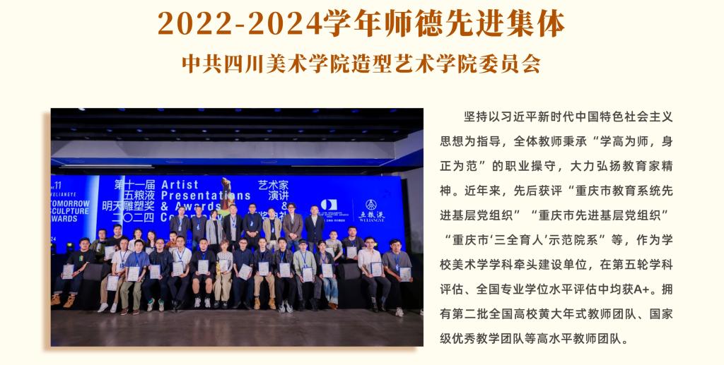 在实践育人中,培养家国情怀、协同行业前沿,做好学生奉献祖国的引路人。强化推进具有国内外影响力的平台项目及创作科研成果建设,完善更新新时代高等美术教育学术体系、学科体系、话语体系的建构。牵头引进国家权威性综合美术大展、创办了“明天雕塑奖”等国内外具有重要学术影响的展览项目。获批国家社科基金项目等省部级以上项目共57项。以中国传统文化的当代活化为路径,以美术学学科前沿问题为切入点,深入“中国话语”的创作与教学,强化国际文明交流互鉴。与英国、意大利等多国院校、机构联合开展“世界之眼,发现重庆”等多项活动。