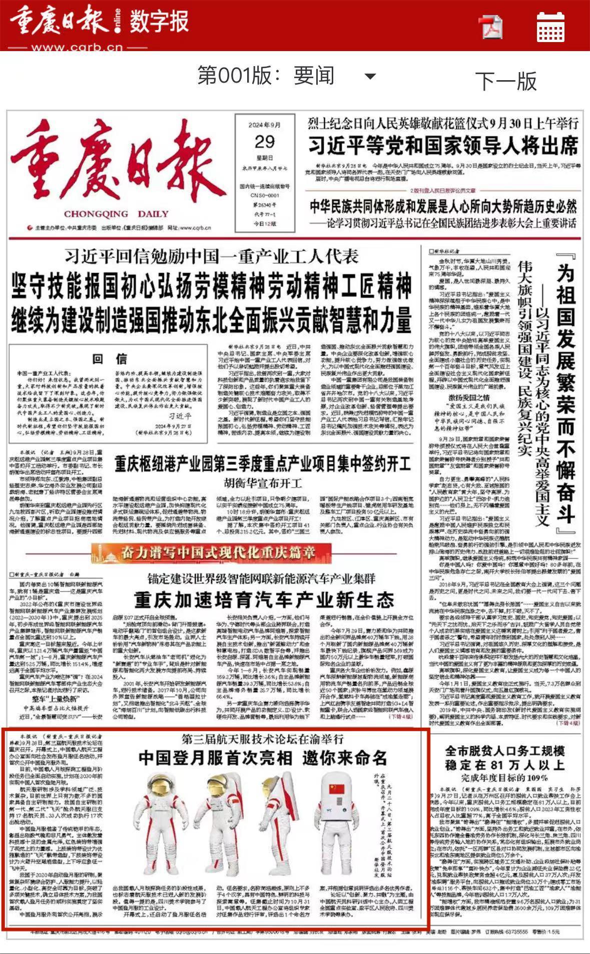 9月28日上午由中国航天员科研训练中心主办的“第三届航天服技术论坛”在重庆召开。此次论坛由中国航天员科研训练中心主办,人因工程全国重点实验室、重庆市梁平区人民政府、四川美术学院等承办。