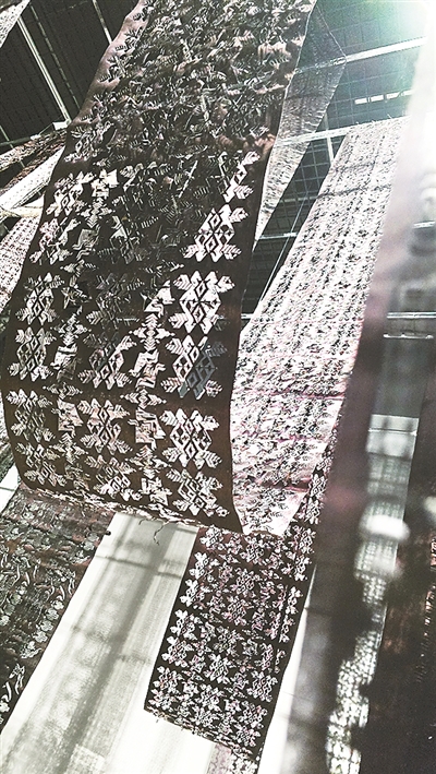 数字长卷《纹·路》选取中国西部地区及中亚共建“一带一路”国家具有代表性的传统纹饰为主题,结合中国西南非遗亮布织物的独特质感,通过现代科技把传统刺绣、织锦与剪纸纹饰融合在一起,以展览现场光影效果的变化呈现出纹饰的历史深度与文化意象。