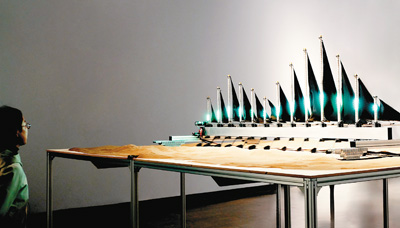 交通网络的建设是推动共建“一带一路”国家合作与文化互鉴的重要基础。互动光影装置《风沙智语》以“交通”为核心词,展现共建“一带一路”国家之间的紧密联系与互动。作品提取部分共建“一带一路”国家的交通贸易数据,将其转化为灯光与机械结构驱动源;采用海上丝绸之路代表性交通工具“帆船”的形态,通过对桅杆、风帆、船桨等要素进行艺术转化、组合,以沙喻水,结合动态交互,构成了作品的最终形态。无人接近时,装置处于“流动模式”,灯光与机械结构如细沙般缓慢变化;当感知观众接近时,装置即进入“数据驱动模式”,产生模式、频率变化的丰富视觉效果。作品希望通过交互的动态光影与序列化机械美感,表现共建“一带一路”国家紧密合作与共荣共生的关系,传达出各国共同进步、携手迈向未来的美好愿景。
