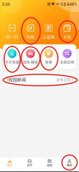 付款码、卡包、卡片充值、挂失/解挂、账单等