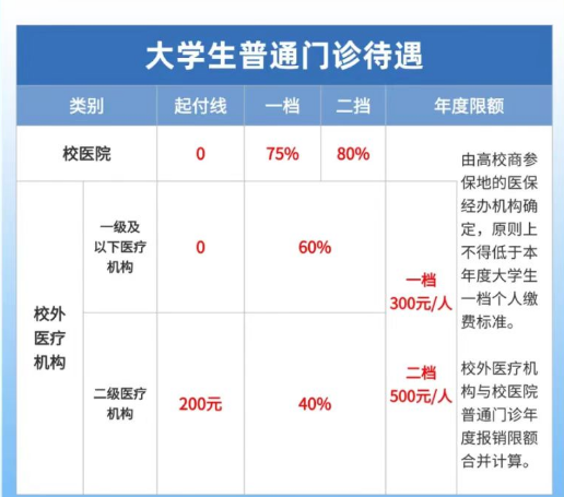从2025年1月1日起大学生医保普通门诊可以在校外一、二级医保定点医疗机构使用,到校外医保定点医疗机构普通门诊就医的费用,与我市居民医保普通门诊统筹待遇保持一致,在学校医务室(卫生所)以外医保定点医疗机构年度报销限额与学校医务室(卫生所)年度报销限额合并计算(普通一档门诊封顶线使用标准为380元/人,普通二档门诊封顶线使用标准为600元/人),在市内定点医疗机构联网结算的普通门诊费用在校医院不重复报销。