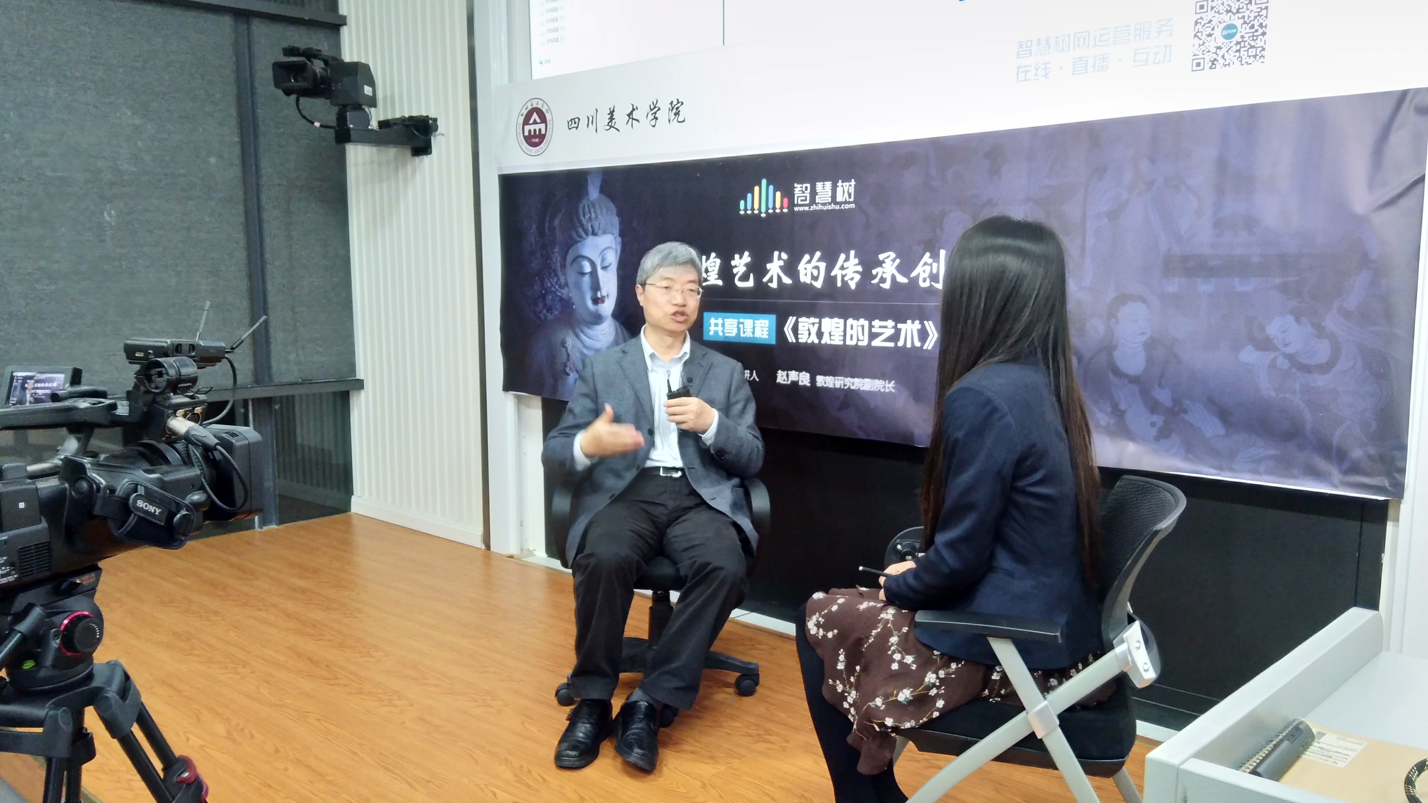 4月27日,智慧树网东西部联盟共享课程《敦煌的艺术》第三次直播互动课程在我校大学城校区设计楼沉浸式教室进行,本次课程面向全国所有选课学校的师生进行直播授课。