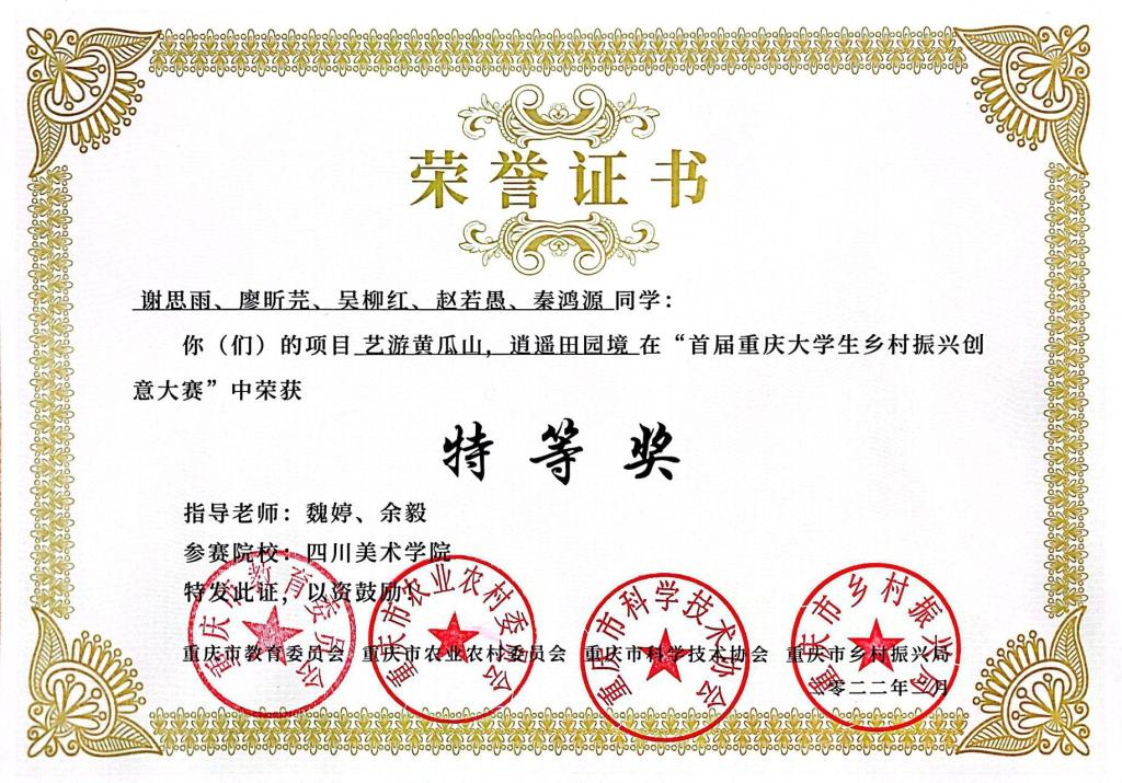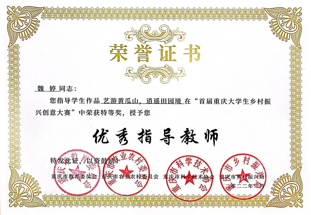 我校在由重庆市教育委员会、重庆市农业农村委员会、重庆市科学技术协会、重庆市乡村振兴局联合举办的首届重庆大学生乡村振兴创意大赛中斩获佳绩,获得特等奖1项、二等奖3项,同时被评为“优秀组织单位”,魏婷老师被评为“优秀指导教师”。