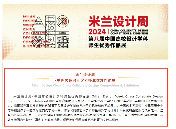 第八届“米兰设计周-中国高校设计学科师生优秀作品展”非命题赛场,四川美术学院建筑与环境艺术学院师生共计荣获24项国赛奖项、81项省赛奖项。