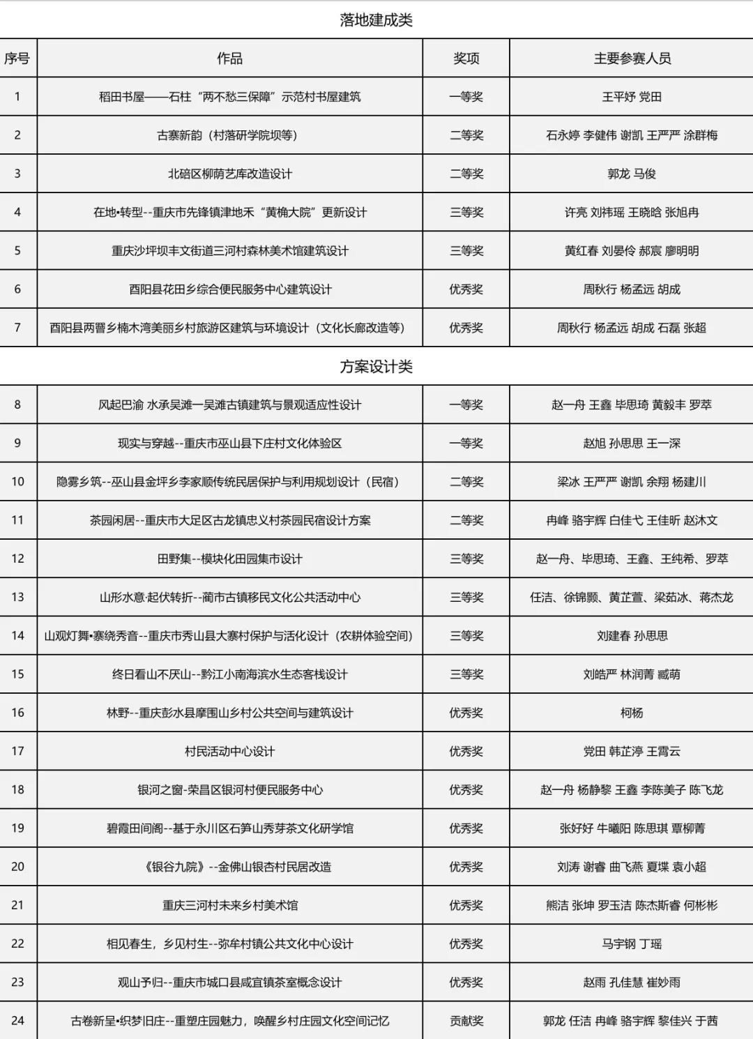 四川美术学院建筑与环境艺术学院师生团队受邀参会,本次大赛四川美术学院师生团队共获得24个奖项,取得丰硕成果。其中落地建成类一等奖1项、二等奖2项、三等奖2项、优秀奖2项。方案设计类一等奖2项、二等奖2项、三等奖4项、优秀奖8项、贡献奖1项。赵一舟副教授代表获奖团队发表感言。